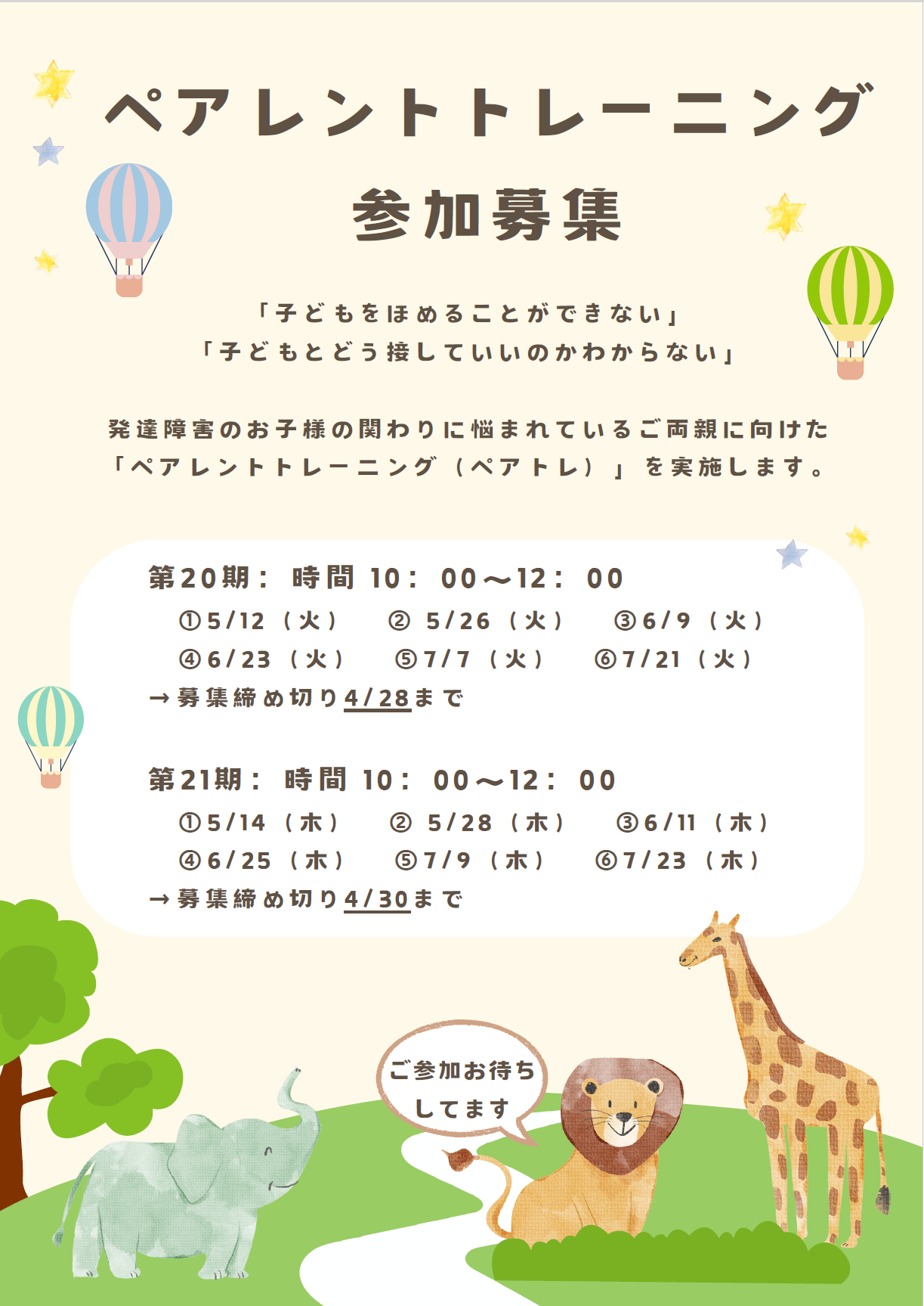 ペアレント・トレーニングとは、発達障害をおもちのお子様の保護者様に向けて、お子さんの行動を変えていくための考え方や、働きかけ方を知っていただくためのプログラムです。