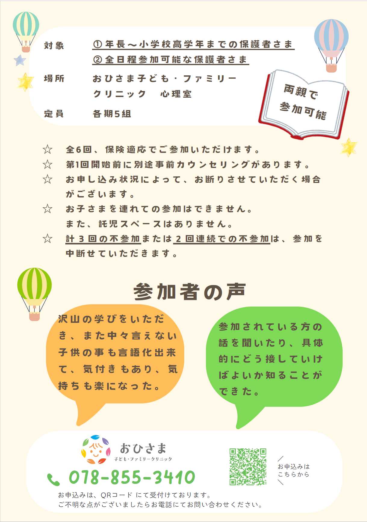 効果的なプログラム運用のために、3~5名程度の保護者様でのグループワークになります。個別での実施では得られる効果が低下することもあり、基本、個別対応はありません。6回の受講が必要で、おおむね隔週での開催になります。全回参加可能な方を対象とするため、一部だけ参加希望はお受けできませんのでご了承ください。